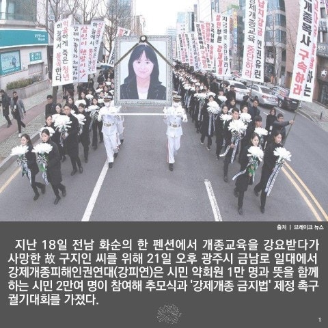 신앙을 지키고자 했던 故김선화집사님과 故구지인자매의 죽음을 일부 언론이나 사람들이 종교에 심취하여 일상생활도 다 포기한 것으로 말하며 그들의 죽음을 퇴색시키고 사건의 본질을 흐리는 행위도 없어졌으면 좋겠다는 생각이 들어 강제개종피해인권연대(이하 강피연) 광주전남지부는 21일 광주 5·18민주화운동 기록관과 금남로 일대에서 강제개종교육의 불법성과 그 피해의 심각성을 알리고 ‘강제개종금지법 제정’을 촉구하는 기자회견과 궐기대회를 개최했고. “살인까지 유발하는 강제개종은 사라져야 한다. 피해자들의 억울한 사연과 호소에 귀 기울여달라”며 “종교의 자유가 있는 나라에서 ‘ 돈벌이’ 강제개종목사들로 인해 납치, 감금, 폭행 등 인권유린을 행하는 강제개종교육이 벌어진다는 게 말이되는지요?