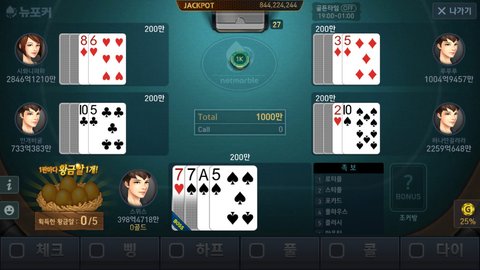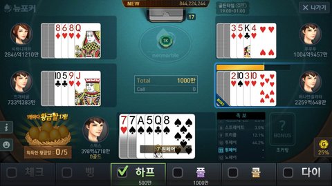오랜만에 모바일로 넷마블 포커를 치고 있는데 처음 패가 정말 좋았습니다