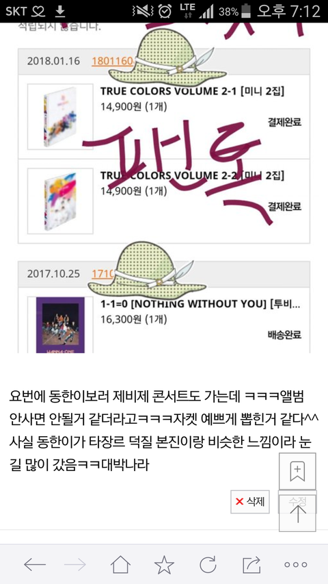 콘서트 가는데 앨범도 사야할거 같다고 썼던 세럼이야^^혹시 내 글을 봤던 사람이 있는지 모르겠지만ㅋㅋ경사났다고 해서 왔다^^인증은 내가 썼던 글 캡쳐해왔어..이제 시작이니까 더 대박나고 좋은일 많이 있을거야ㅋㅋ프듀로 알다보니 남의 일 같지가 않다 축하해^^