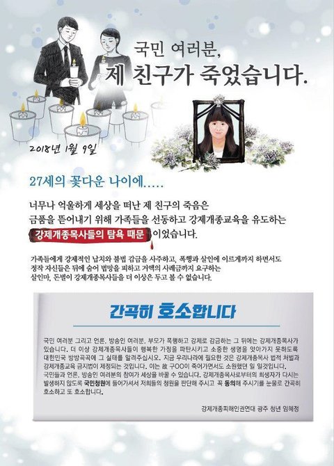 이에 지난 1월 20대 젊은 여성이 강제개종교육의 희생양이 되어 싸늘한 시신으로 돌아온 사건이 있습니다.