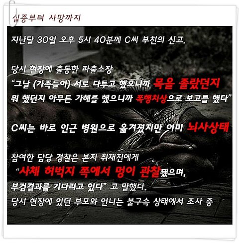 여러분~!언제부터 대한민국이 이런 무서운 세상으로 변했는지 모르겠습니다. 꽃다운 20대, 하고 싶은것이 많은 창창한 나이의 청년이 가족에 의해 사망한 사건을 아시나요?어찌 대한민국에서 이런 일이 일어날수가 있을까요??자식을 키우는 부모의 입장에서 참으로 애통하고 원통하기 그지 없습니다..