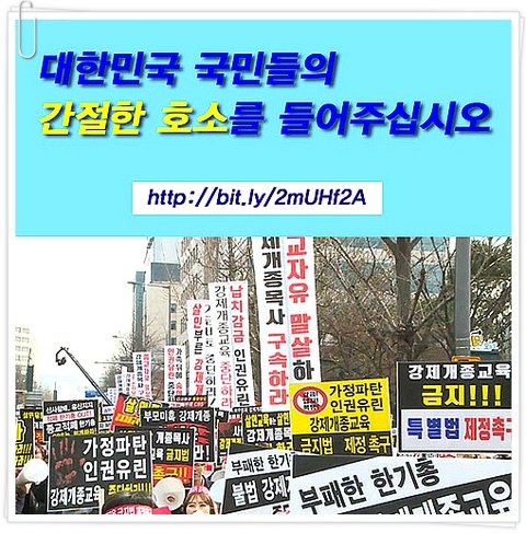 “친언니는 개종목사가 지시한 대로 나를 감시하려고 다니던 초등학교(직장)를 휴직했고, 엄마도 직장을 그만 두었고 이후 가족들끼리 신뢰를 잃어 힘든 나날을 보냈다”이에 “이단상담소 폐쇄와 강제개종목사 법적 처벌과 종교차별 금지법 제정을 간곡히 부탁드린다”“강제 개종교육으로 납치와 감금 등등... 인권유린을 경험한 피해자만 천명이 넘는다는 사실을 알게 되었다”
