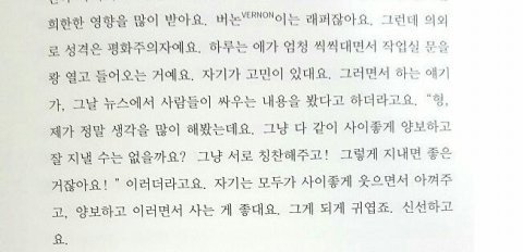 헐 아 진짜 맴찢... 혼혈도 이정도인데 아예 외국인이면 더 심했을 거 아니야..? 우리나라에 혼혈, 외국인 꽤 있는 편이고 연예인 중에서도 많은데 그들이 버논이 말한 저 시선을 느끼고 상처받는다고 생각하니까 너무 슬프다. 물론 버논이 어릴 적에 한 말이라 지금은 그 때보다 나아졌을 수도 있겠지만 아직도 외국인(╋혼혈) 차별은 빈번하니까... 사람들이 알아뒀으면 하는 게, 차별이라는 게 안 좋은 것만 차별이 아니야. 그냥 외국인이라는 이유로, 다른 인종이라는 이유로 특별하게 대우하는 것 자체가 차별이야. 예를 들면 외국인이라서 괜히 귀여워 보인다는 생각 같은 것도 차별이야... 한국 문화에 적응을 못 해서 도와주는 등의 행동은 차별이 아니지만 버논처럼 이미 한국에서 오래 살았고 한국인과 다름 없는 사람에게 외국인이니까 적응 못 했겠지 지레짐작하고 먼저 나서 행동하는 것도 차별이 될 수 있어. 우리나라는 한민족 국가였지만 시대가 달라지면서 점점 외국인도 많이 들어와서 살고 우리나라에서 아예 정착해서 살 거나 태어나는 혼혈, 다른 인종도 많잖아? 그렇기 때문에 이런 부분은 번거롭더라도 먼저 조심해야 할 거같아. 도와주기 전에 먼저 물어본다거나.. 단지 외모적으로 다르다고 해서 다르게 행동하고 보는 것이 그들에게 얼마나 상처가 될 지 생각해주라.