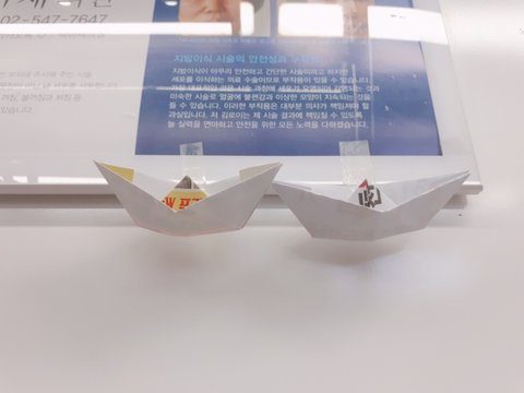종이배 세개 쭈루룩 벽에 붙여놨는데