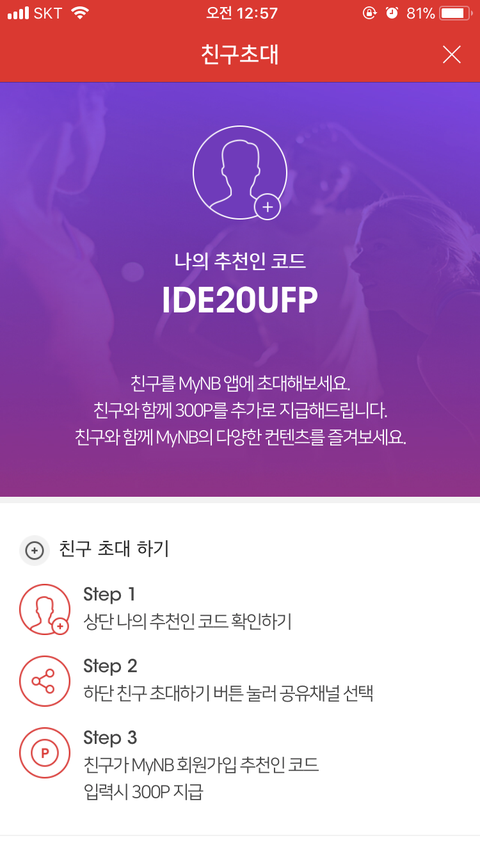 1.Mynb앱을깐다 2.로그인을한다 3.추천인을 입력한다.(생략가능(하면 300포인트) 4.차곡차곡 모아서 마일리지변환후 사고싶었던 물건을 산다! 추천인:IDE20UFP