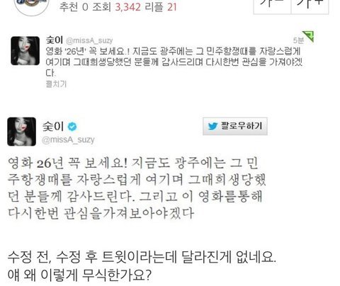 이 때다 싶어서 다른 걸로 까지마 지식에 대해 비난은 괜찮은데 너네 몇 몇은 선을 넘어서 비판을 하잖아. 글씨체는 사람의 거울이라고? ㅋㅋㅋㅋㅋ 말도 안 되는 소리 좀 하지 말자 적당히들 해 비난이랑 비판은 하늘과 땅 차이야. 나 수지 팬 맞고 고쳐야 할 점은 고쳐야 된다고 생각해. 근데 언어장애느니 뭐니 심한 말은 하지 말자. 팬들 이미 도가 지나친 댓글은 피디엪 땄어..