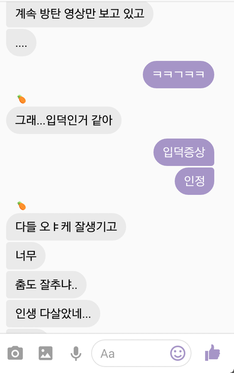 근데 몇달전부터 자기가 애들영상찾아보고 방탄노래 추천해달라길래 해줬더니 찾아듣고는 애들 칭찬을 아끼지않는거야