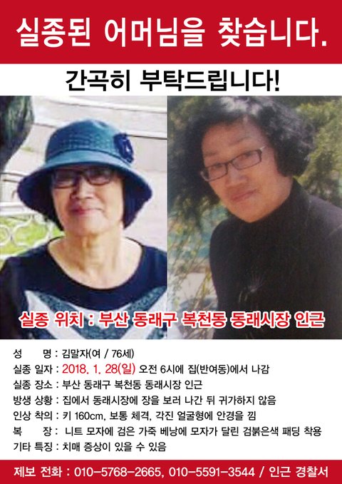 2018년 1월 28일(일) 오전 6시경 부산 반여동에서 어머님이 장보러 나가셔서 아직까지 연락도 없이 사라지셨습니다. 마지막 핸드폰 위치가 동래시장에서 멈췄습니다. 현재 동래지역 파출소에 실종 신고가 접수된 상태이고 아직까지 찾지 못하고 있습니다.