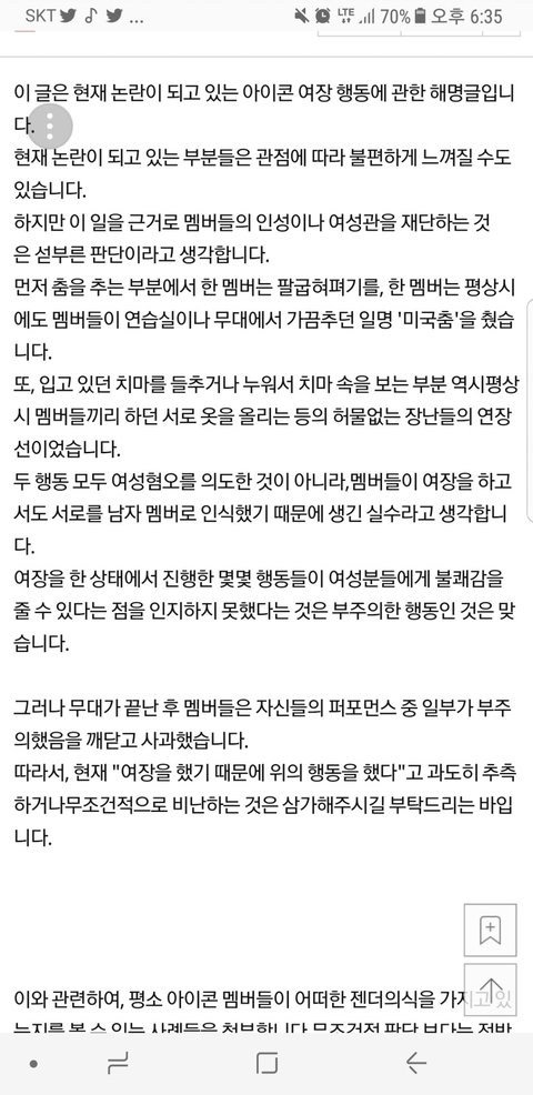 저거 콘서트 당시에 사과했음. 본인들은 여장을했던 안했던 그냥 같이 사는 남정네들로밖에 보이지 않았기에 자기들끼리 장난치면서 웃고논건데 솔직히 경솔했던건 맞음ㅇㅇ 관객을 위한 배려가 부족했었음. 하지만 결국 불편하셨겠다고 죄송하다고 당일 날 사과를 했고, 영상에 잘 들어보면 중간에 바비가 ‘야 이건 아니다’ 인가 이런 말 한거 들림ㅇㅇ. 고의적이지 않았던 이런일은 사과면 충분하다고 생각하고, 또 다음부터 이런 일 없으면 됨.. 너네한테 평생 비난 받을 정도의 일인건 에바임