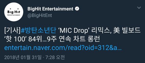 ‘MIC Drop’ 리믹스, 빌보드 ‘핫 100’ 84위 9주 연속 차트 롱런