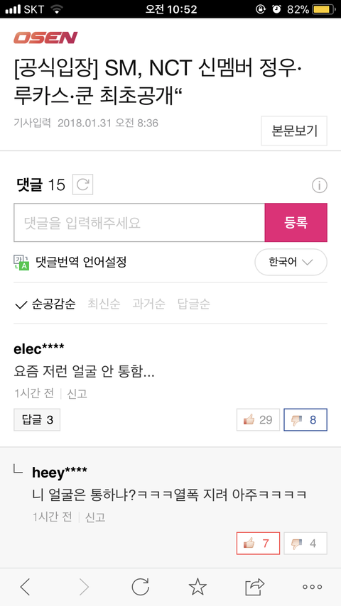 기사가 여러개 떴는데 이기사 악플이 참 ... 그리고 그냥 지나치지말고 같이 정화좀하자 뭐 나왔을때만 좋아하지말고 지금 막 나온애들한테 저게 말이냐
