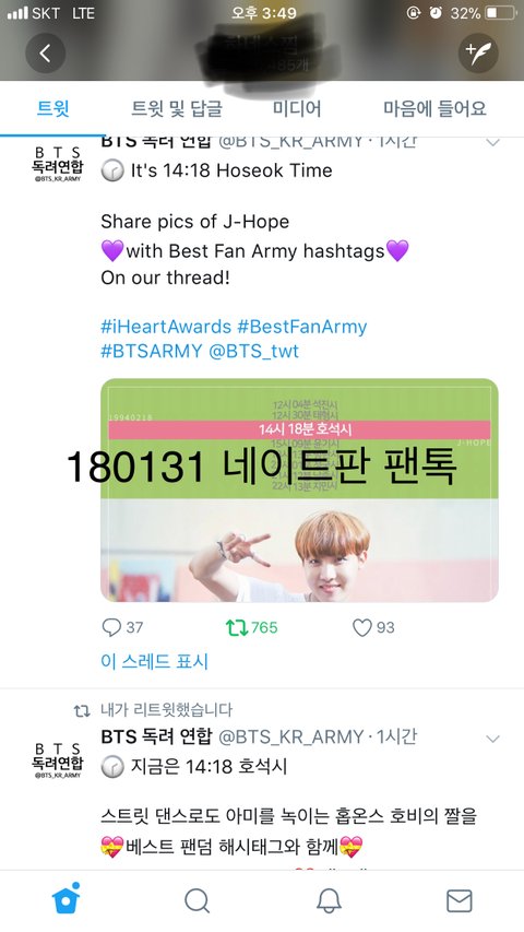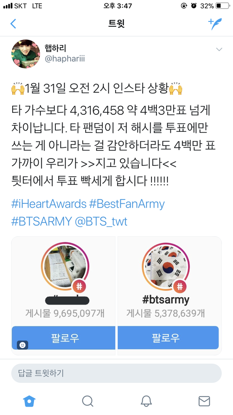 저쪽은 팬덤해시 자체가 원래부터 써왔던거고 우리는 btsarmy로 집계되서 저렇게 보이는것일뿐 실제는 우리가 더 많아 저쪽 점점 인별 투표율이 높아지긴해도 아직까진 우리쪽의 참여율이 더 높고ㅇㅇ 그니까 저 글에 상관없이 열툽하자!!