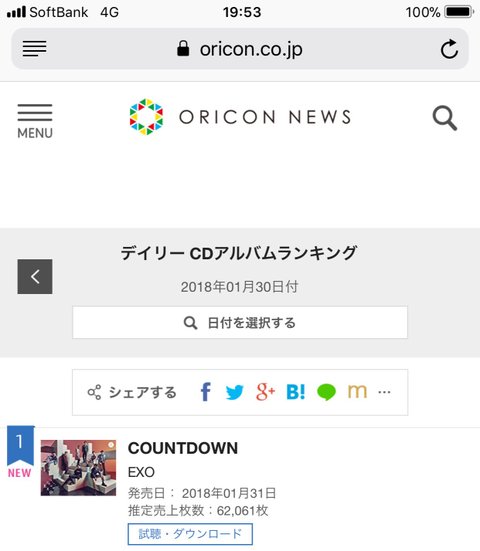 엑소 카운트다운 오리콘 1위