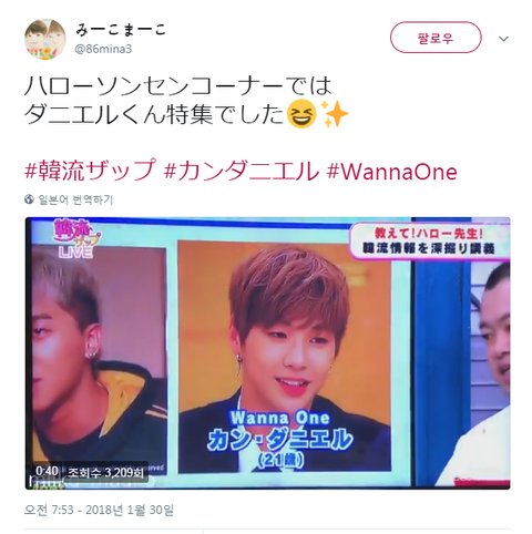 한류점푸 하로센세란 프로고 내용은 상사병을 일으키는 강다니엘 현상이라는 말이 생겨나게한게 대단하다 천연적인 부분도 있는데 슈퍼에서 산 수박을 자동차 뒷자석에 움직이지말라고 안전벤트를 채워줬다 귀엽고 상냥하다 그런점에서 천연큐트계다