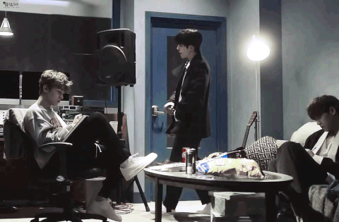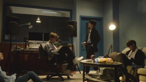 녹음실에서 가사 쓰고 듣고 있는 힙합팀
