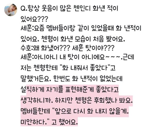 이게 인간 남자들끼리 할 수 있는 대화맞냐....? 쟤는 얼마나 착하거야ㅋㅋㅋㅋㅋㅋㅋㅋㅋㅋㅋ 아무리 이미지 메이킹이라고 해도 같은 그룹 애들이 맨날 저렇게 착하다 착하다 하는거 보면 진짜 인거 같은데 어떻게 화를 내고 나중에 화낸거 미안하다고 하는 사람이 있고 화를 내줘서 고마운 사람이 있짘ㅋㅋㅋㅋㅋ 이정도면 어지간히 안싸운듯ㅋㅋㅋㅋㅋㅋㅋ