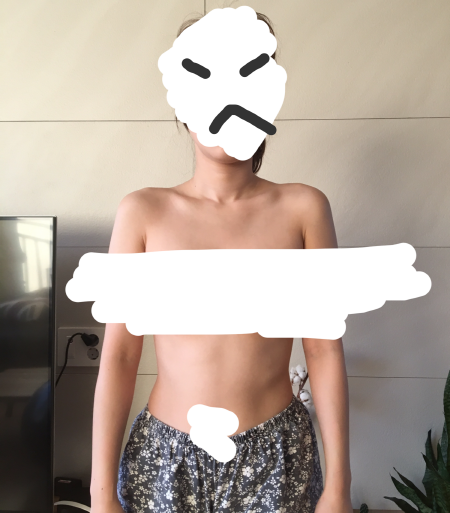 어깨는 굽고 한 쪽이 치솟아있고 골반도 눈에 띄게 높낮이가 다름.