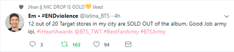 "내가 사는 지역 20개 타겟중에 12개 매장에서 방탄앨범 매진. 아미들 칭찬햌ㅋㅋㅋ"
