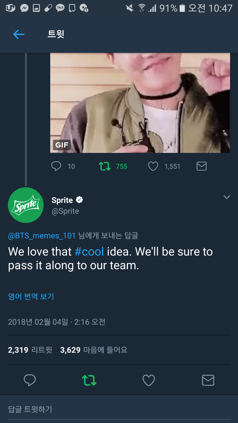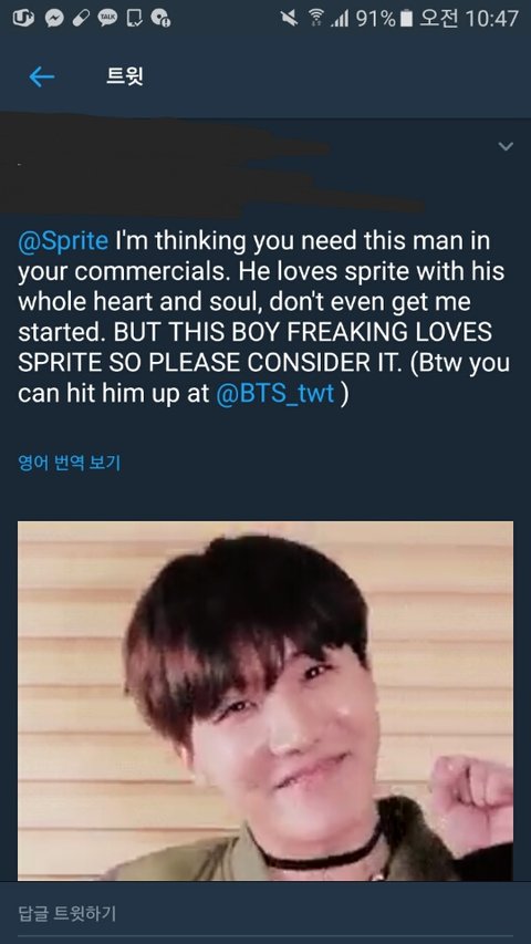 외랑둥이가 스프라이트에 광고 모델로 호석이가 어떻겠냐고 직멘 쐈는데 스프라이트가 좋은 아이디어라면서 답멘 달았어 ㅋㅋㅌㅋㅋㅋㅋㅋㅋㅋㅋ 성공적인 영업이다