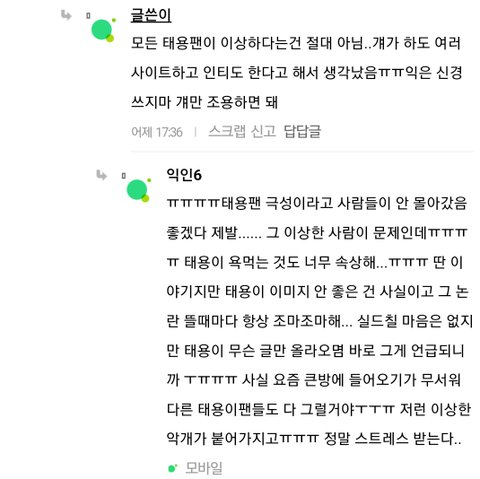 중고 루머랑 태용이 과거 패드립 잘못땜에 안그래도 입덕장벽 소리듣는 엔시티인데 그나마 반응 오는 멤버들마다 쟤가 찾아가서 행패부리고 까고 다니니까 더무시받지...태용팬들이 작년부터 배척하고 다닌 쟈니 도영한테 이입하고(그렇게 까고다녀놓고 이입하는게 너무 소름) 재현 마크 텐 유타 윈윈등 딴멤버들 까는거보면..;;;해찬이는 깠다 편들었다하더라 싫어하는 이유도 유치함 해찬이가 재현이 룸메로 친하다고 싫어함 드림도 싫어하고..제발 그만해 태용팬아 너때문에 좋았던 태용이까지 감정 생겨