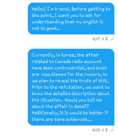 일단 내가 뭐라고했냐면 현재 한국에서는 캐나다 라디오 계정과 관련된일이 논란이되고있고 이에 엑소엘들이 루머로 비난받고있다 그래서 우리는 이 루머에대한 사실을 밝히고자하고 반박에 앞서 이 상황에대한 자세한 정황을 알고싶다 자세하게 이일에대해서 알려줄수있겠냐 추가적으로 증거가 있으면 좋을거같다 이런식ㅇㅇ