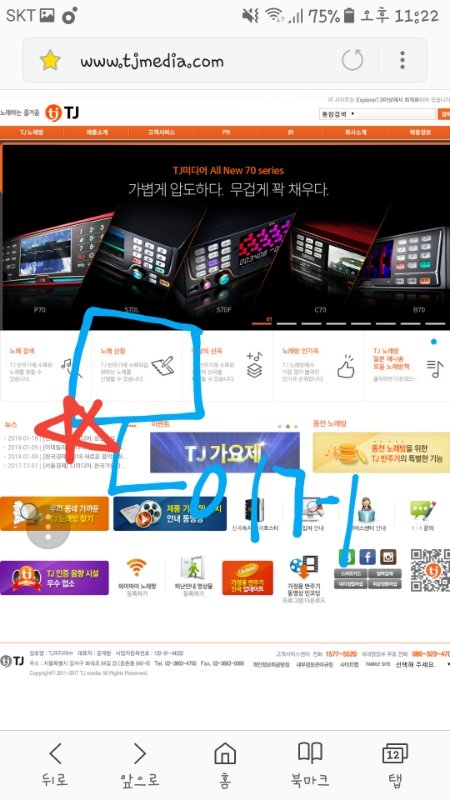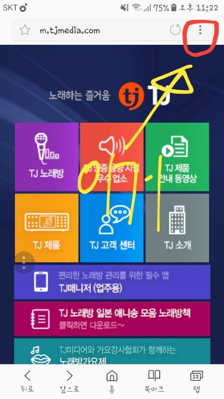 일단 ㄴㅇㅂ에 TJ미디어를 검색하고 사이트에 들어가면 이렇게 나오는데 오른쪽위 점3개 누르고 PC화면으로 바꾸고