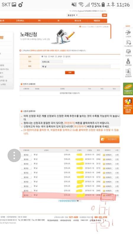 여기서 제일 밑에있는 추천수 젤 큰거 보이지? 그거에 추천하기 눌러줘 그냥 노래를 신청하는것 보다 추천수가 많아지는게 추가될 확률이높으니까 추천하기를 눌러줘!!!