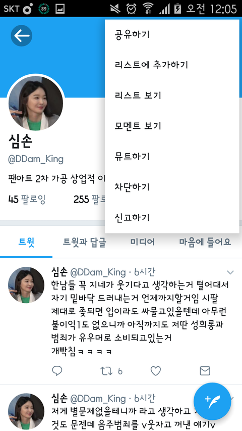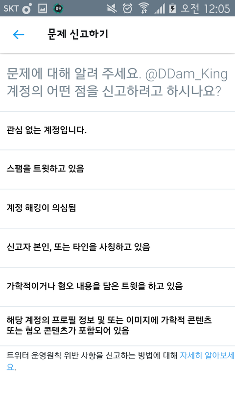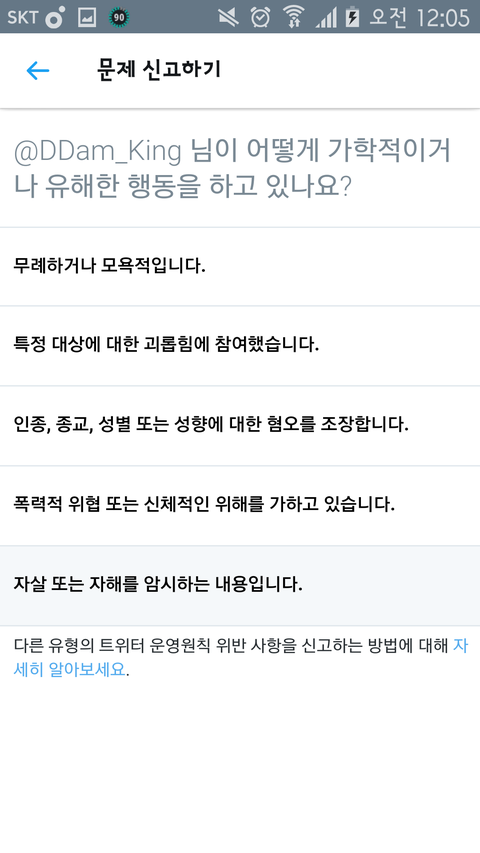 일단 신고 버튼 누른 후 5번째-2번째-문제가 된 트윗은 많으니까 아무거나 선택하면 돼