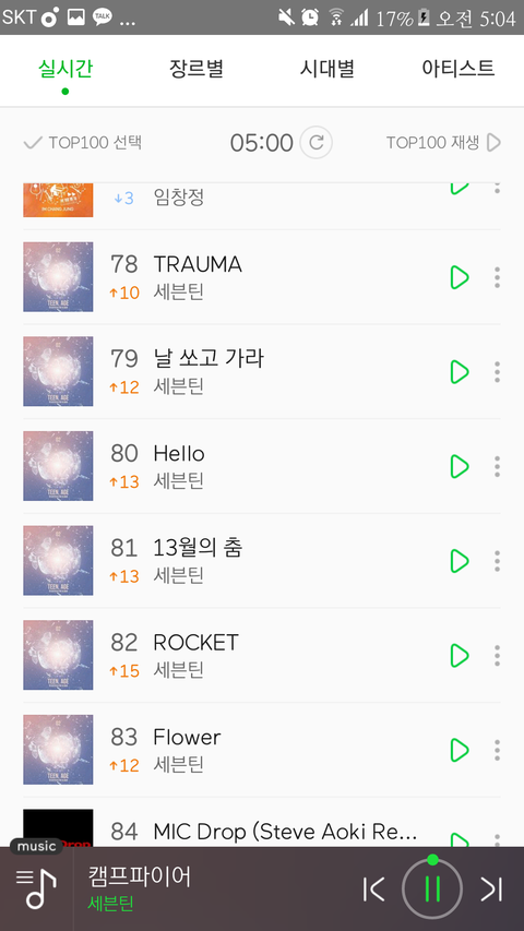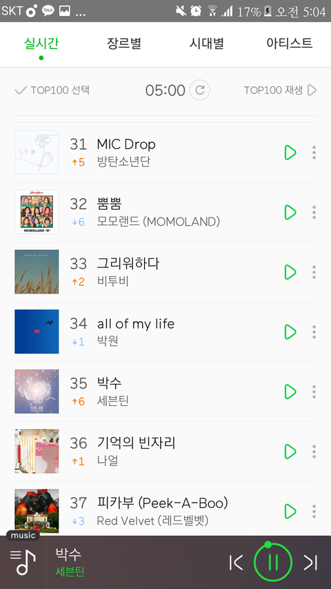 셉틴 모의총공 박수 차트인만 하자 하고 다들 바랐는데 박수 35위까지 했네!! 앞으로가 더 기대된다 고맙다도 대박나자