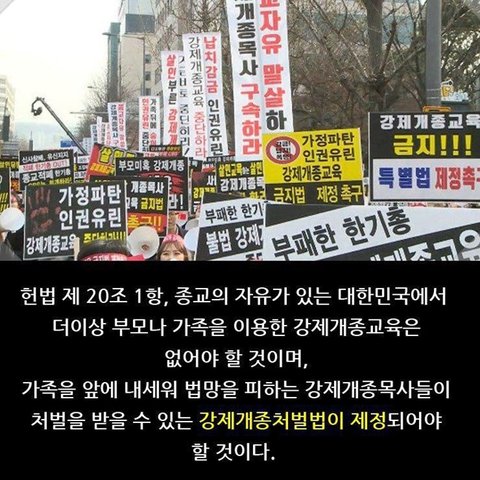 돈을 위해서라면 어떠한 짓도 서슴치않는 강제개종목사들에 의해서 수많은 사람들이 지금도 강제 납치, 감금, 협박, 인권침해, 살인위협, 자살위협, 가정불화 회복불능 등을 겪고 있습니다. 하루속히 우리나나라에서 강제개종으로 인한 폐해가 더 이상 발생하지 않도록 모든 사람들이 나서서 국가와 사회와 가정을 어지럽게 뒤흔드는 강제개종목사들의 구속과 처벌에 적극적으로 동참해야 합니다.