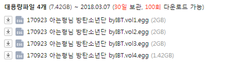 여기 아미들 기차가 뭔지 모르는 것 같던데ㅠㅠ 영상을 내 메일로 보낸 후에 그 주소 공유하는거얌내가 올린 주소 복붙해서 주소창에 넣은다음에 엔터치면 저절로 다운된다!파일 하나당 총 100번 다운 가능해용량 큰 영상들은 버벅대는 경우 있는데 난 곰플로하면 버벅대서 팟플레이어 쓰고있어