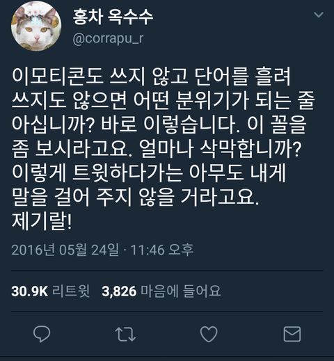 음,, 약간..? 이런 트위터 말투,.,. 랄ㄲ ㅏ...,,?? 넘무,, 빡치거 찌질해,,,보여.. 으 어엄 젭발 , , 쓰지 말라고,.,., 게다 가 이렇게 띄어쓰 기 이 상하게 쓰는 애들도 잇삼 , , , 틧터 말투는 트위터 에 서,, 만 ,., ^^.. ㅅㅂ ㄹㅇ 카톡할때 계속 이러면 한대 치고싶어 작작써라