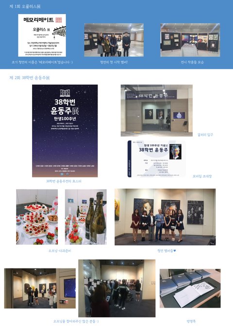 1회 오큘러스전, 2회 38학번 윤동주전에 이어 세 번째 전시를 함께 할 새로운 멤버를 모집합니다. 현재 회화, 디자인, 공예, 사진, 음악 등 다양한 전공자 6명으로 이루어져 있습니다.