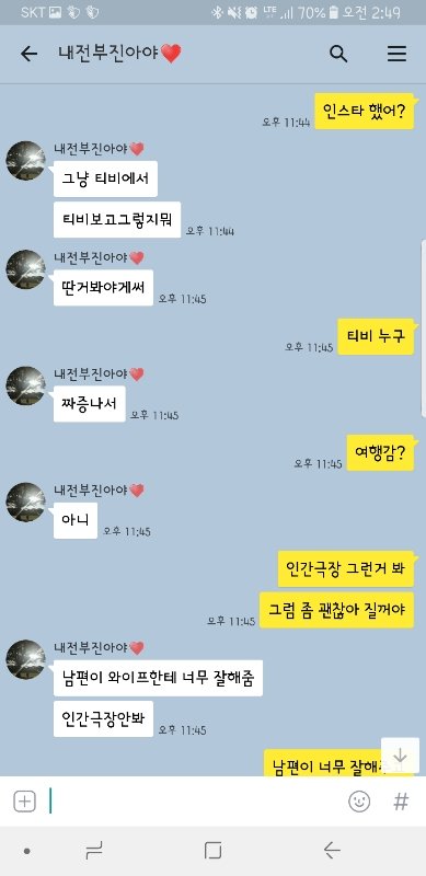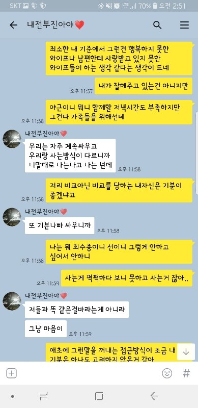 근데 와이프는 이게 비교가 아니라 그냥 티비보면서 든 일종의 가벼운 푸념 정도로 생각합니다. 그냥 우리도 예쁘게 사랑 하고 싶어서 그런거다 라는데.. 전 접근방식이 너무 잘못된거 같습니다...