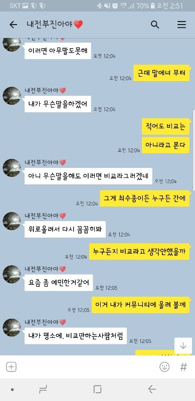 적어도 제가 아는 비교란 그 어떤 대상으로 하여금 나와 저울질 한다거나 그 능력치를 견주는 것인데 보여드릴 대화에는 그 내용이 다분히 포함되어 있는거 같습니다.