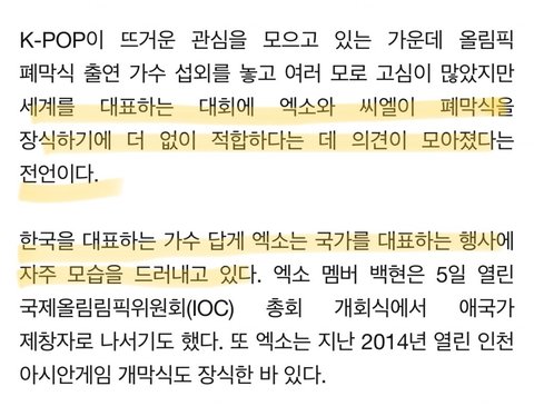 세계를 대표하는 대회에 엑소와 씨엘이 폐막식을 장식하기에 더 없이 적합하다는데 의견이 모아졌다는 전언이다 ㅈㄴ엑뽕 쩐다진짜로 첸백시는 한중무역협정개막식 백현이는 ioc개막식 나가더니 엑소는 평창 폐막식이야ㅠㅠㅠㅠㅠ
