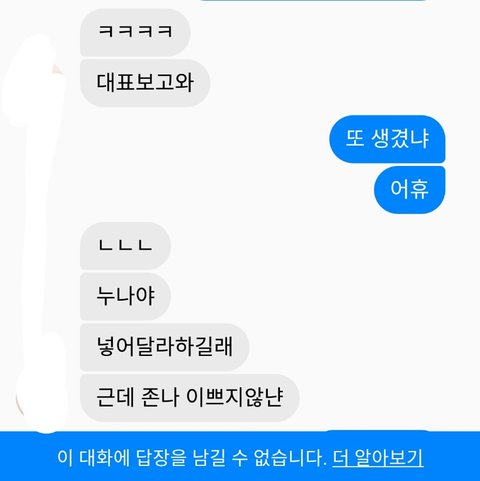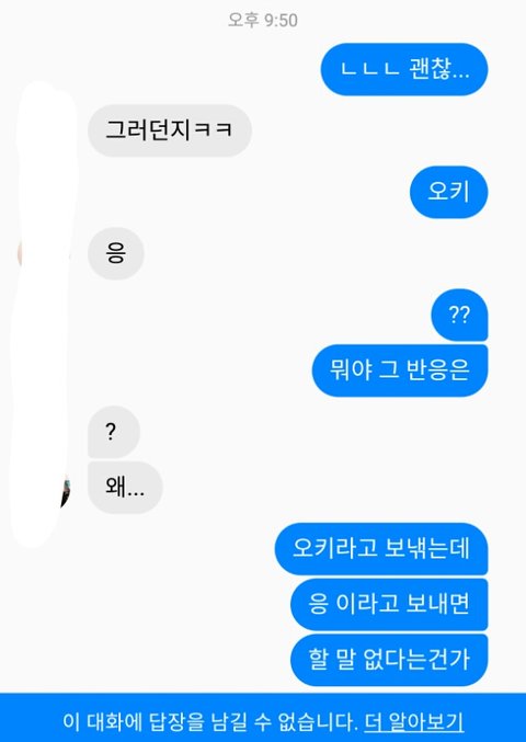 나 저번에 헤어지고 나서 바로 연락와서 그냥 연락하다는 남자앤데 진짜 허언도 심하고 그래서 별로 안 좋아하거든 그래서 요즘 말투 띠껍게 보내고 저렇게 하다가 별명 지 혼자 설정해둔거 지 혼자 삭제하고 나 차단 박음 ㅅㅂ 어이 개털리네 불쌍해서 연락해줬더니 까여버리네