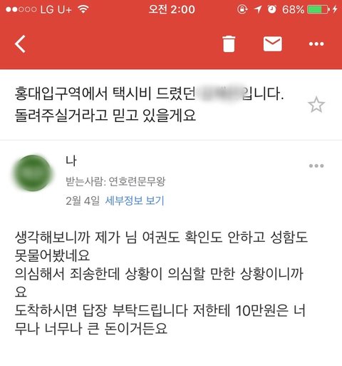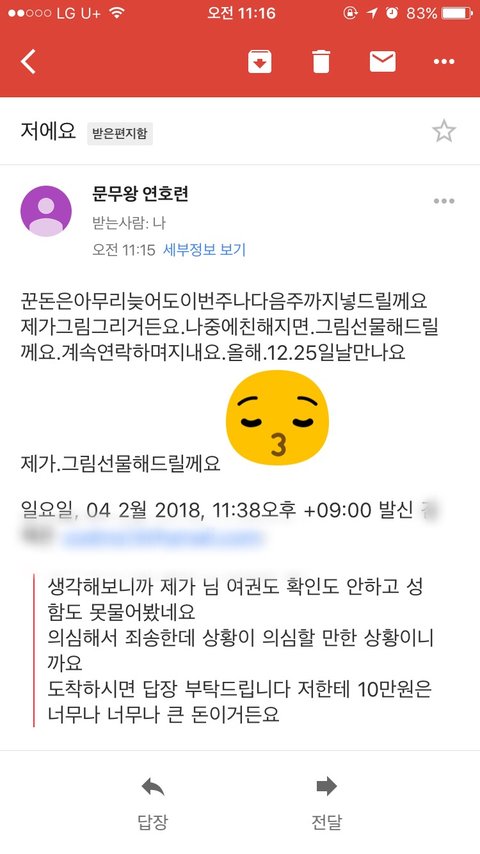 저는 도착하면 꼭 이메일 보내달라고 조심히 들어가시라고 인사를 하고 지하철을 타는데 생각하면 생각할수록 쎄한 느낌이 들어 112에 신고를 하였고 경찰 선생님이 그분이 내일중으로 드리기로 했으니 일단 믿어보시고 내일중으로 입금을 안하면 바로 고소하시는게 좋을거 같다고 하셨습니다.