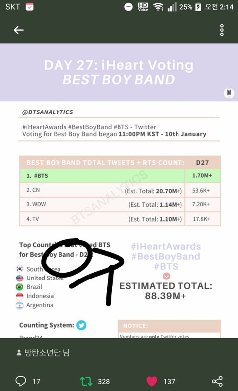 신기한게 우리 거의 팬투펴 몰빵수준인데 보이밴드 투표 늘 1M넘게 투표되더랔ㅋㅌㅌ