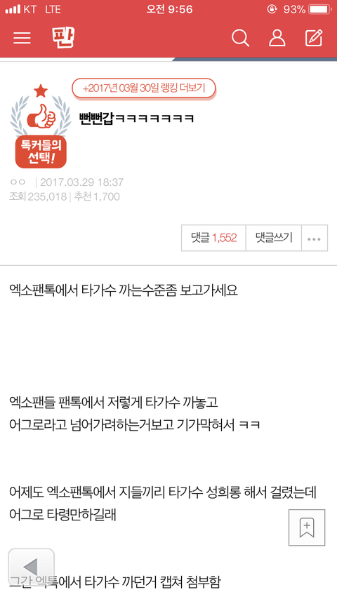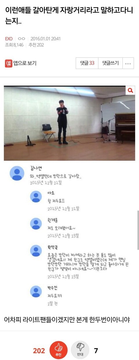 관심꺼라 엑소엘 없음 덕질이 안되냐 맨날 할말없을때 하는 얘네 주장 이건데 니네부터 관심좀끄지그랬어ㅋㅋㅋㅋ 팬톡에서 엑소는 안앓고 남의 팬덤부터 앓은게 누군데? 추천수를 봐라. 다 어그로라고 하게? 지네가 먼저 남의 팬덤 대놓고 깔땐 언제고 이제 엔터애들ㅇㅣ 너네 까니까 엑소엘좀 놔줘~우리없음 덕질안돼? 하는거 웃기지않냐?