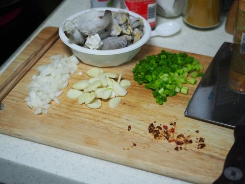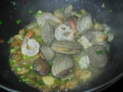 마늘향이 주방을 가득 채울때쯤 양파와 페파론치노를 넣고, 볶다가 양파가 약간 익어간다 싶으면 준비된 해물을 넣고 볶아줍니다. 이때 소금과 후추로 간을 약간 해두시고, 비린내를 잡을 목적으로 화이트와인을 조금 둘러줍니다. 색감을 위한 쪽파도 조금 넣어보았습니다.(냉장고 정리용)