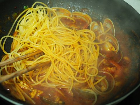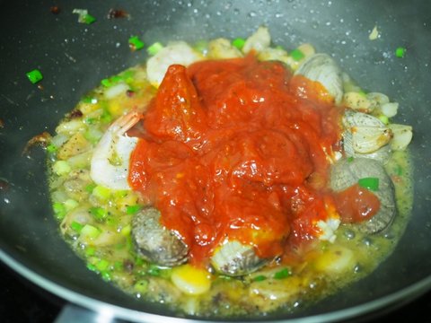 바지락이 어느정도 익었으면 토마토소스를 넣고,