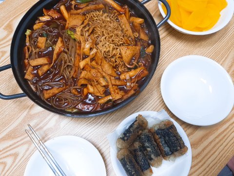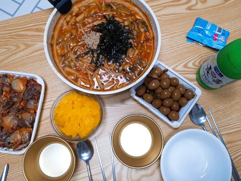 짜장떡볶이 만들고 김말이 좀 튀겨서.. 또 소주와 함께..