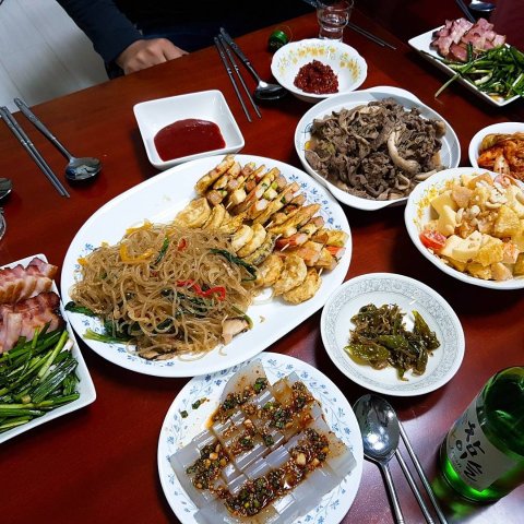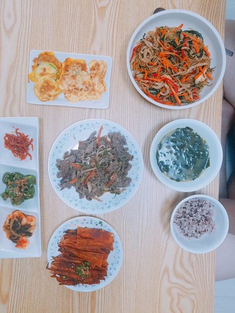 잡채, 더덕구이, 불고기, 호박전, 소고기미역국 ㅎㅎ