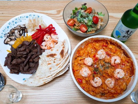 이것이 1차였고 술마시면서 퀘사디아, 옥수수콘버터, 참치카나페 등등 더 준비해줬다 ㅋ