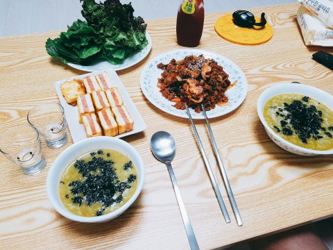 전복죽 끓이고 제육볶음이랑 스팸두부샌드부침