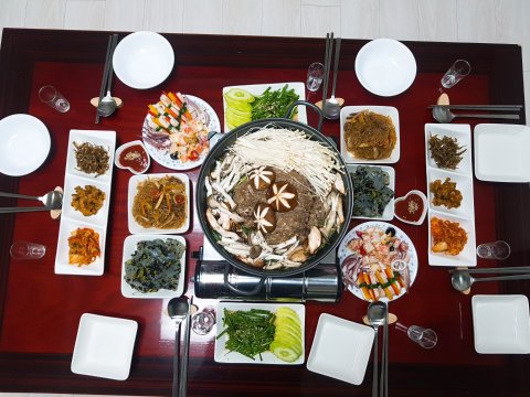 소고기버섯전골, 오징어강회, 과일사라다, 부추무침, 잡채