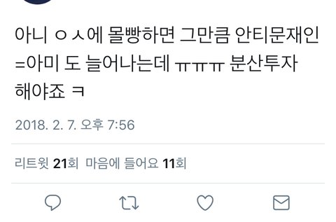 moon 머통령 님 팬들이 우리 좋아해주시잖아 근데 머통령 님 팬이면서 동시에 저쪽 팬인 사람이 자꾸 이런 식으로 얘기하고 자꾸 한쪽만 좋아하면 안된다 분산 투자 이러는 사람들 다 저쪽 팬이면서 머통령 팬인 사람들임 밑에 사진들 다 동일 인물인데 기분 개더러워