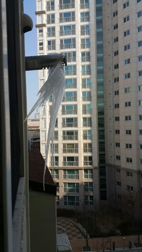 1. 윗집 보일러 연통에서 물이새어 저희 연통에 계속 물이 맺혀 저렇게 큰 얼음이 생겼습니다