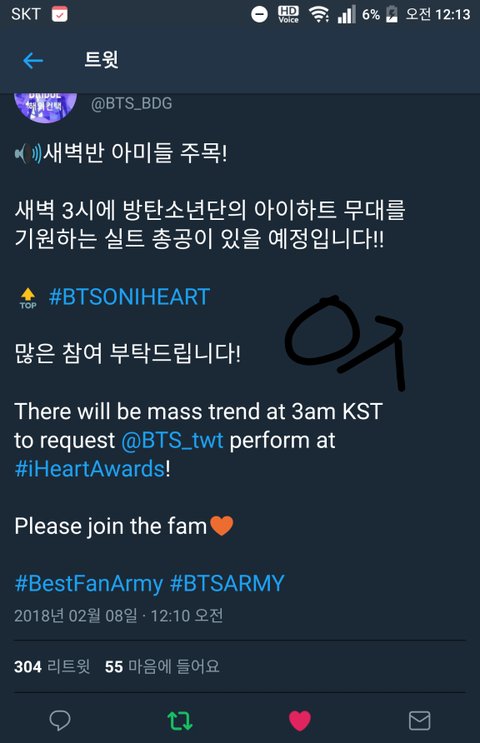 새벽 3시에 방탄소년단의 아이하트 무대를 기원하는 실트 총공이 있을 예정